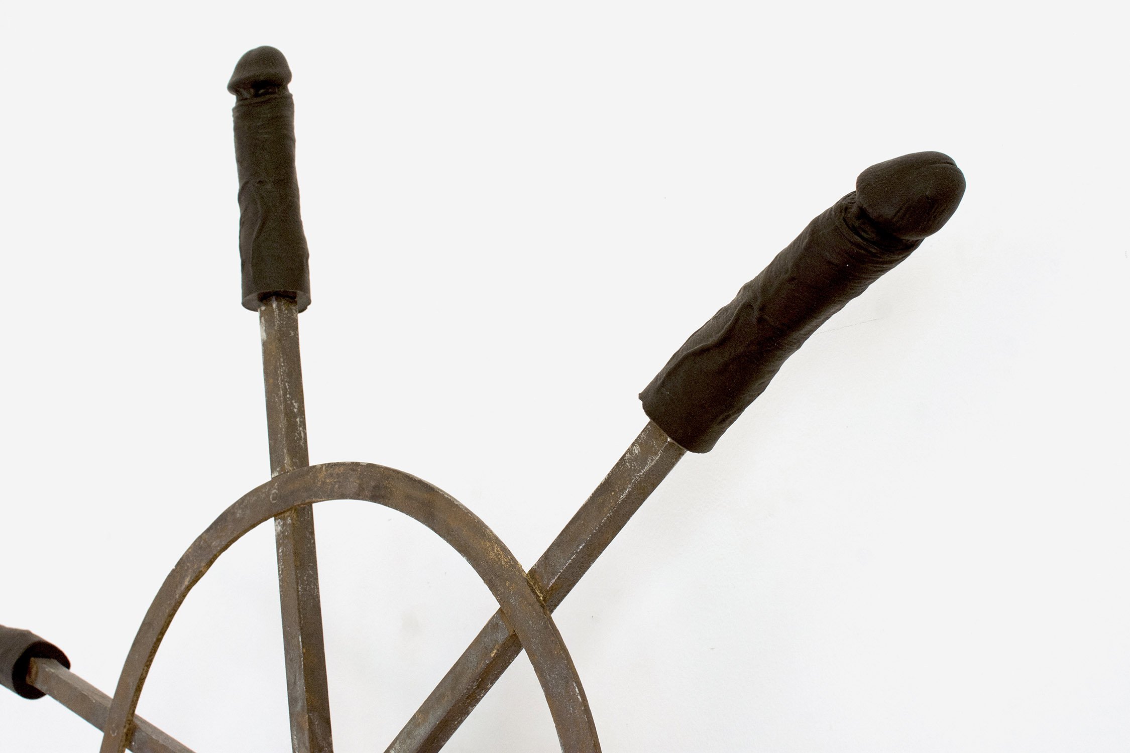 cast silicon, steel zimmer frame, mechanical components and found materials. Dimensions variable.